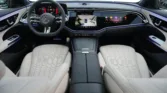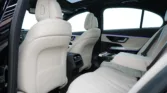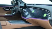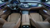The cabin features comfort seats, a nappa leather multifunction sports steering wheel, and trim in black piano lacquer with open-pore ash wood. It includes the AIR-BALANCE package, ambient lighting with logo projection, and ventilated front seats with memory and lumbar support. Dual-zone air conditioning is optimized for hot weather conditions.